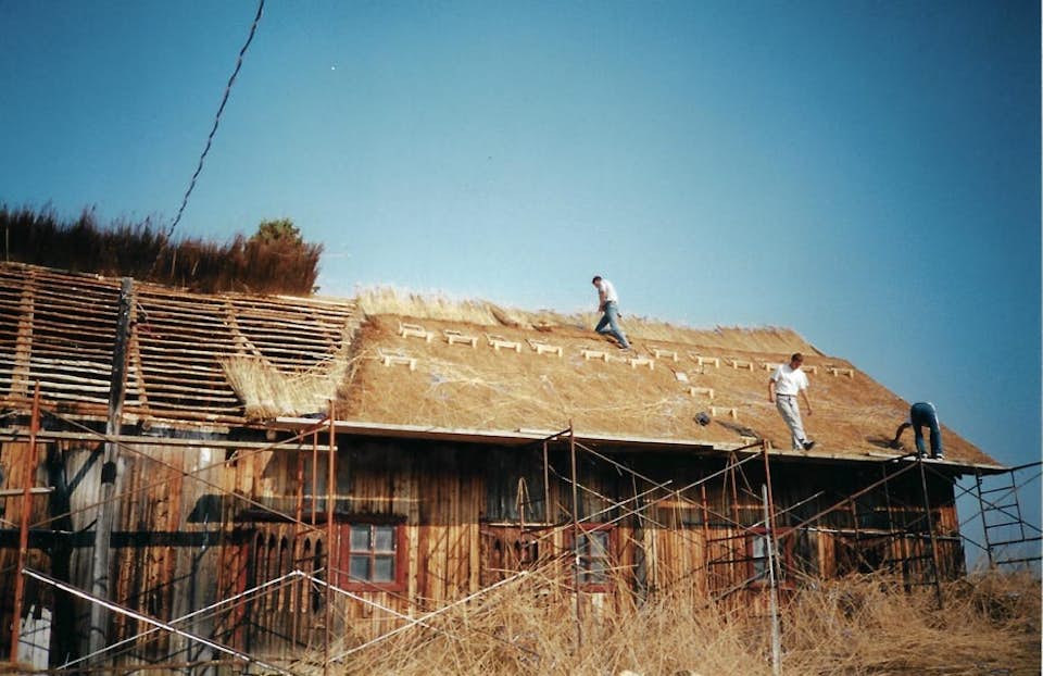 Pour des raisons de durabilité, on a permis à la firme Le Goff d’utiliser cette technique lors de la rénovation de la grange Lajoie. Des joncs ont remplacé la paille de seigle traditionnellement utilisée, un matériau aujourd'hui difficile à trouver et de faible durabilité.